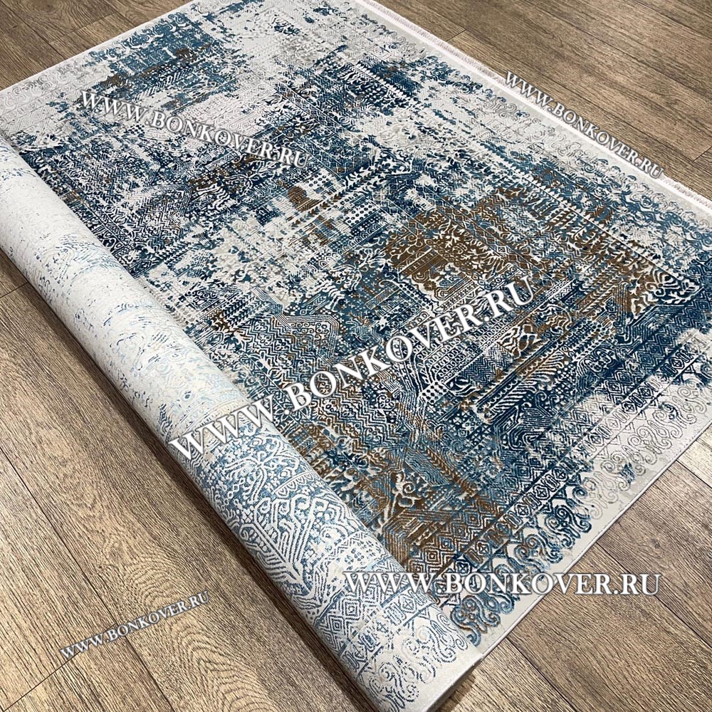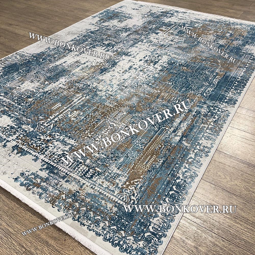 Элегантный Высокоплотный Премиальный Ковер из вискозы Дизайн 02 Голубой с Бежевым наполняет интерьер гостиной теплом и уютом, гармонично сочетает в себе изящество и стиль. Он соткан из высококачественного сырья, прочный и долговечный.